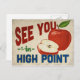 Una encantadora postal de viaje vintage de High Point North Carolina con una hermosa manzana roja, junto con un divertido texto de estilo retro que dice: "Nos vemos en High Point"