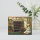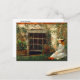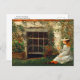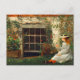 Postal de arte fino con la pintura, The Four-Leaf Clover (1873), de Winslow Homer (1836-1910), artista estadounidense del movimiento Realismo. Un chica con un vestido blanco y una gorra de paja sentado junto a una vidriera con un trébol de cuatro hojas, al lado de plantadores de geranios.