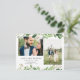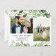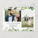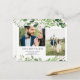Esta elegante, negra y blanca boda gracias postal cuenta con un lugar para dos de sus fotos personales favoritas y un montón de follaje verde acuarela.