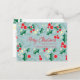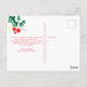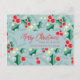 Difunde la alegría navideña a tus clientes y socios con esta tarjeta postal empresarial festiva de Navidad. La parte delantera presenta un encantador patrón de estilo retro de hojas de acebo verde oscuro, bayas rojas brillantes, ramitas de pino y estrellas amarillas sobre un fondo azul suave. El mensaje "Feliz Navidad de todos en NOMBRE DE TU EMPRESA" se muestra de manera prominente en fuentes script y sans-serif rojas.