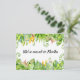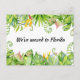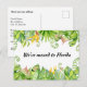 Hojas tropicales de color verde, naranja y color rosa forman un borde en la parte superior e inferior de nuestra postal de dirección con las palabras en la parte delantera: "Nos hemos mudado a Florida". Puede cambiar este texto fácilmente al desproteger. La parte posterior de la nueva tarjeta de dirección es completamente personalizable con su información personal.