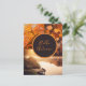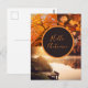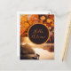 Aquí viene una tarjeta postal rápida de otoño para decir hola otoño o Feliz Día de Acción de Gracias en su área personalizable. Tiene un círculo marrón, naranja, donde puede poner su nota personal. El círculo está rodeado de fotos de un árbol con hojas naranjas, hojas coloridas de verano indio y una romántica vista al lago con sus luces en otoño.