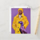 Hombre con impermeable amarillo con un perro morado con IA generó arte