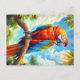 Un vibrante macao escarlata con plumas azules y verdes se perfila sobre una rama, con el telón de fondo de un cielo azul brillante con nubes blancas onduladas. La cabeza del pájaro se gira ligeramente a un lado, mostrando su pico negro agudo y sus ojos inteligentes. El frondoso follaje rodea la rama, creando un ambiente de jungla tropical.