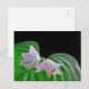 hoja verde de plantas de hosta y flores púrpura que muestra anteras y estambres con rocío contra negro