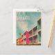 EXCLUSIVO a la república vintage: diseño de afiches de viaje estilo retro del Palm Springs Hotel con balcones llenos de color en un moderno hotel de mediados de siglo (el Hotel Suguaro) contra un cielo azul y palmeras.
