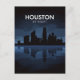 A flat-vector illustration of the Houston skyline silhouetted against a dark, cloudy night sky, with a deep blue reflection shimmering on the water below.
