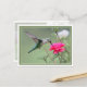 Un colibrí se cierne ante una flor mientras recolecta néctar.