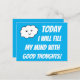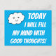 ¡Qué tal esta adorable postal de color azul acuático que dice 'HOY LLENARÉ MI MENTE CON BUENAS PENSACIONES!' en grandes letras blancas debajo de una linda y extremadamente feliz nube sonriente!