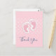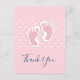 Tarjeta de agradecimiento con una imagen adorable de huellas de bebé niña rosa con lunares blancos sobre un fondo rosa detrás de la ilustración.