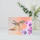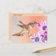 Postal con un colibrí del naranja allen en vuelo, con las alas abiertas y los pies en frente listos para aterrizar sobre flores moradas. Se puede ver en detalle su brillante naranja iridiscente de cobre y sus plumas verdes. Bonita carta única para los amantes de las aves, el jardín y la naturaleza. Foto tomada en Pasadena, California.