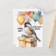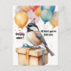 Celebra con un carbonero acuarela hilarante que lleva un sombrero de cumpleaños, posado en un regalo con globos en el fondo. Este diseño ligero y ingenioso aporta un toque divertido a cualquier cumpleaños, perfecto para los amantes de las aves y los fanáticos del humor por igual. Contenido generativo.