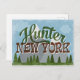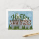 Hunter New York diseño de viajes neo vintage en divertido estilo retro personalizado con montañas nevadas, bosques y árboles debajo, cielos azules y texto retro fresco.