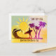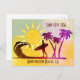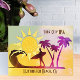 Surf se levanta y el sol está afuera. Un surfista, llevando su tabla de surf, se aleja de las palmeras y se dirige a las olas del océano que se estrellan. Las brillantes vigas de sol llegan hasta la playa de California. Las palabras Surf City USA están por encima de las obras de arte y Huntington Beach, CA reside a continuación. Los colores son marrón oscuro, magenta, verde salvia, naranja, amarillo dorado y azul humo. El diseño colorido tiene un efecto bokeh.