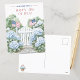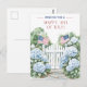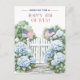 Tarjeta Postal Encantadora De Feliz 4 De Julio Con Una Ilustración Serena A La Acuarela De Una Puerta De Jardín Blanca Enmarcada Por Lujuriantes Hydrangeas Azules Y Adornada Con Dos Banderas Estadounidenses Ondeando. El Diseño Elegante Y El Toque Patriótico Lo Hacen Una Forma Sofisticada De Compartir Sus Deseos De Vacaciones Con Amigos Y Familiares.