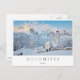 Tarjeta postal de la iglesia de Colfosco cubierta de nieve con al fondo las montañas del Grupo Sella de los Dolomitas en un hermoso paisaje invernal en Alta Badia, Tirol del Sur, Italia con un borde blanco y el texto 'Dolomitas, Italia'.