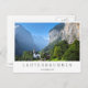 Foto postal de un paisaje suizo con una iglesia rodeada de altas montañas de los Alpes como Eiger y Jungfrau en un día de verano en el valle de Lauterbrunnen, Bernese Oberland, en Suiza con un borde blanco y el texto 'Lauterbrunnen, Suiza'.