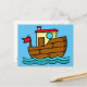 Postal con ilustracion de un personalizado. El fondo del barco está formado por tablas de madera marrón, la cabina es de color crema con una puerta marrón, una ventana redonda y un techo rojo. Volar en la parte trasera del barco es una bandera roja. El pequeño barco navega sobre las olas del océano.