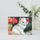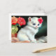 Postal con gatito blanco. Mientras el gatito mira fijamente con los ojos azules, las flores rojas adornan sus oídos. Un jarrón de rosas rojas se sienta al lado del gatito blanco. ¡Un regalo maravilloso para los amantes del gato y del arte victoriano!