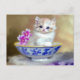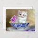 Postal con un gatito blanco esponjoso. El gatito de ojos azules se sienta en un tazón azul con flores rosas. Una manta morada con flores está cubierta por delante. Un regalo maravilloso para los amantes del gato y del arte victoriano.