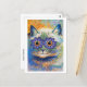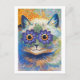 Postal de arte fino con un ilustracion animal de un gato de pelo largo con flores violetas alrededor de los ojos, del artista británico Louis Wain (1860-1939). Era un ilustrador más conocido por sus dibujos de gatos durante la época de arte.