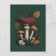 Una hermosa ilustración botánica de estilo vintage que presenta una majestuosa seta agárica, un caracol y hojas de otoño sobre un fondo oscuro. Perfecta para los amantes de la naturaleza y el bosque.