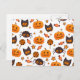 Patrón de halloween super lindo. En este ilustracion se pueden ver calabazas, arañas, búhos, estrellas y dulces. El esquema de color de este diseño de halloween es naranja, negro y blanco.