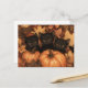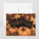 Ilustracion acuático de un trío de gatito negro con fondo de hojas y calabazas otoñales.