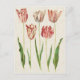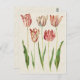 Postcard con un ilustracion vintage de tulipanes rojos, rosados y blancos del Codex Gottofer, 1649-1659. Limpiado digitalmente y mejorado para que parezca una acuarela sobre un fondo de textura antiguo de color claro que es de época.