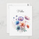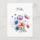 Una ilustración en acuarela de hermosas flores en turquesa, melocotón, rosa, púrpura, azul. Esta estampa botánica es perfecta para un simple saludo de Hola, pero puedes cambiar el texto a tu saludo preferido. Gráfico asistido por IA comprado con uso comercial. Obra de arte: DreamCafeArt
