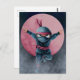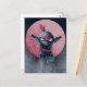 El guerrero ninja con un traje azul oscuro con una banda roja en la cabeza y una ceniza roja saltando por las nubes frente a una luna roja en un cielo oscuro.