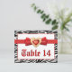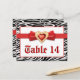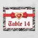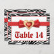 Impresión de cebra blanca negra con arco rojo y boda de joyas número postal personalizado que cuenta con un borde de cebra blanco y negro y una cinta roja a través de ella con un arco y una joya en forma de corazón también en rojo con contorno de oro y corteza que le agrega un poco de ostentación. Hay que destacar que el arco y las joyas de los diamantes del corazón son un ilustracion "impreso en" y no un cristal real, al igual que la estela. Este moderno diseño combina elementos modernos y de moda con el viejo estilo inglés que le da un toque de modernidad y retro. Un diseño elegante y elegante, perfecto no sólo para una boda de invierno.