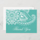 Este verde azulado paisley indio gracias a la postal es perfecto para un boda moderno. El diseño del mehndi incluye una hermosa henna mandala floral y motivos paisley sobre un fondo turquesa. Personaliza la parte posterior de la tarjeta postal con tus nombres, tu dirección de retorno y un mensaje de agradecimiento. Como alternativa, deje en blanco la sección de plantillas de mensajes de agradecimiento para escribir a mano una nota personalizada cuidadosa en cada tarjeta después de su llegada. Estas tarjetas se pueden usar para un boda, una ducha de novia o cualquier evento especial. Coincide este diseño con las piezas coordinadas en morado, turquesa, rosa y naranja en la Colección Boda Paisley Indio Colorida: https://www.zazzle.com/collections/119662428781277925.
