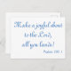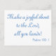 Haz un grito alegre a Dios usando esta hermosa postal. Sobre un fondo blanco, "¡Cállate alegremente con el Señor, todos ustedes aterrizan!" El salmo 100:1 está escrito con una bonita letra azul. ¡Elige la tuya!