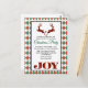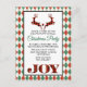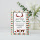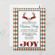 Una postal de invitación de un partido de Navidades con un ilustracion de 2 Navidades de ciervos saltando. Los ciervos están hechos de leñadores rojos y negros, con un poco de corazón entre ellos. Alegría escrita al final. El fondo es un patrón de argyle rojo y verde.