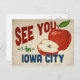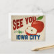 Una encantadora postal de viaje de Iowa City Iowa con una hermosa manzana roja, junto con un divertido texto de estilo retro que dice, "Nos vemos en la ciudad de Iowa"
