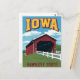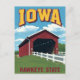 Celebrate the heartland with this charming, vintage-style travel postcard for Iowa! The design features a classic red covered bridge—a quintessential symbol of Iowa's rural landscape and history—set against a bright blue sky and lush green fields. The bold, collegiate-style "IOWA" text and "HAWKEYE STATE" nickname give it an authentic, retro travel poster feel, reminiscent of WPA-era art. This postcard is perfect for sending greetings from the Midwest, collecting as a state souvenir, or framing as unique countryside wall art for anyone who loves farming, Americana, or classic American scenery.
