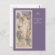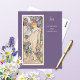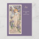 Una postal con el ilustracion vintage de Alphonse Mucha de The Flower Series, Iris (1898), que ha sido restaurado y mejorado digitalmente. Retrato de una mujer en un vestido de noche rodeado de flores de iris de lavanda.
