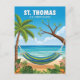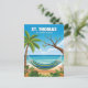 Una hamaca a rayas cuelga de una rama de palmeras sobre una playa de arena con el océano y el cielo como telón de fondo.