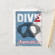 Diseño de afiches de viaje con máscara de basura del Caribe de Jamaica. Un buceador azul y blanco de fondo bajo la bandera con una máscara de escoba retro y la palabra "buceo" en la parte superior.