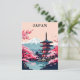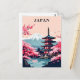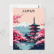 Un ilustracion japonés de postales de viaje con el Monte Fuji, una pagoda japonesa tradicional, y florecientes cerezos en primavera. Un recuerdo japonés perfecto o una postal de arte colectivo para viajeros y amantes del arte.