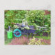 Todas las herramientas necesarias para empezar a trabajar en el jardín. Flora de ruedas, lata de riego, ollas, plantas y herramientas.