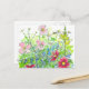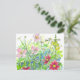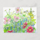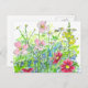 Postal floral colorida con pargos amarillos, cosmos rosas brillantes, camomila y flores silvestres rosas con una abeja miel visitante dibujada en pluma y tinta con acuarela.