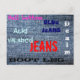 El fondo es material de jean azul. "Jeans" de rojo en primer plano. Además de "vaqueros azules", "fondos de campana", "lavado con ácido", "denim" y "pierna de bota" en varios tamaños, colores y estilos