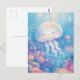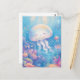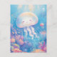 This heartwarming design features an incredibly sweet and round jellyfish shown drifting joyfully through a vibrant underwater paradise. The jellyfish has a translucent, soft-colored bell with a blissfully happy face, closed eyes, and a small smile. Its long, wavy white tentacles flow gracefully through the crystal-clear turquoise and light blue water. The character is surrounded by a lush garden of hand-painted pink, blue, yellow, and orange coral reefs at the bottom of the frame, with small fish and tiny stars scattered throughout the scene. Beams of bright golden sunlight filter down from the surface, illuminating the water and creating a cheerful, magical atmosphere filled with soft bubbles. The overall aesthetic is bright, cozy, and full of wonder, making it an irresistible choice for fans of marine life and playful ocean art. This cheerful jellyfish postcard is a wonderful choice for sending a warm "thinking of you" note or a sun-drenched greeting to a friend who finds joy in the colorful magic of the sea. You might choose to use this artistic card for an under-the-sea themed birthday invitation or as a sweet way to share news of a summer beach trip with your family. It also makes a precious decorative piece for a child's nursery wall or a bright addition to a creative scrapbooking project as a small token of aquatic happiness. This versatile design is also an excellent choice for a holiday thank you note, a graduation message, or as a heartwarming way to share a message of joy for any situation or event.