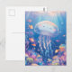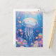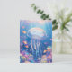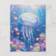This heartwarming design features an incredibly sweet and round jellyfish shown swimming joyfully through a vibrant underwater paradise. Created as a high-quality digital illustration in a soft, whimsical style, the jellyfish has a translucent lavender and blue bell with a blissfully happy face and bright pink rosy cheeks. Its long, delicate trailing tentacles flow gracefully through the crystal-clear turquoise water. The character is surrounded by a bustling community of small orange clownfish and shimmering bubbles that drift among a lush garden of hand-painted pink, purple, and yellow coral reefs. Beams of bright golden sunlight filter down from the surface, illuminating the scene and creating a cheerful, magical atmosphere. The overall aesthetic is bright, cozy, and full of wonder, making it an irresistible choice for fans of marine life and playful ocean art. This cheerful jellyfish postcard is a wonderful choice for sending a warm "thinking of you" note or a sun-drenched greeting to a friend who finds joy in the colorful magic of the sea. You might choose to use this artistic card for an under-the-sea themed birthday invitation or as a sweet way to share news of a summer beach trip with your family. It also makes a precious decorative piece for a child's bedroom wall or a bright addition to a creative scrapbooking project as a small token of aquatic happiness. This versatile design is also an excellent choice for a holiday thank you note, a birthday message, or as a heartwarming way to share a message of joy for any situation or event.