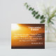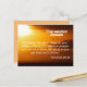 La tarjeta postal de Jeremías 29:11 Felicitaciones presenta una hermosa salida del sol y puesta de sol que muestra el versículo Jeremías 29:11, que dice "Porque yo sé los planes que tengo para ti," declara el SEÑOR, "planes para prosperarte y no para dañarte, planes para darte esperanza y un futuro." En la parte posterior, dice "Que el Señor te bendiga, te dé paz y dirija todos tus caminos mientras lo sigues. Felicitaciones por tu graduación, tu futuro es brillante.