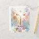 La postal de Pascua representa una hermosa cruz de madera acuática con un fondo abstracto azul, rosa y blanco. Presenta el título de un himno cristiano: "Jesús lo pagó todo". El saludo, la oración pueden ser personalizados o borrados para un mensaje escrito a mano.