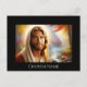 Una inspiradora tarjeta de visita religiosa cristiana con Jesús sonriendo en un bosque celestial con hermosos rayos de sol. Perfecto para iglesias, estudios de la Biblia, escuelas cristianas o librerías religiosas.