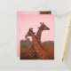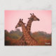 Postal jirafas paradas en árboles mopani con cielo rosa
